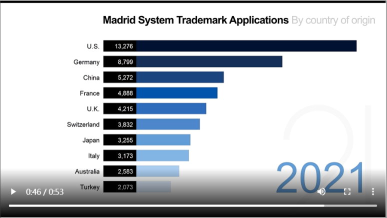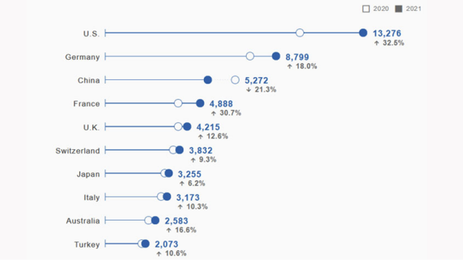 2021 年,美國申請人提交的國際商標申請數量最多(總計13,276 件),同比2020年增長 32.5%。